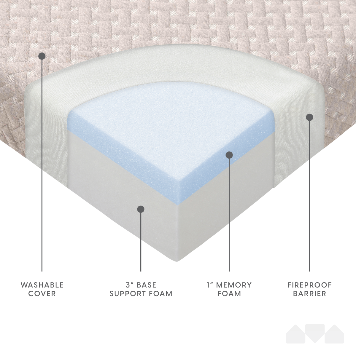 - The three inch foam base is sturdy and built to last and the 1 inch memory foam top layer adds superior ergonomic comfort so you can have that perfect night's sleep whether you're at home or on the go.